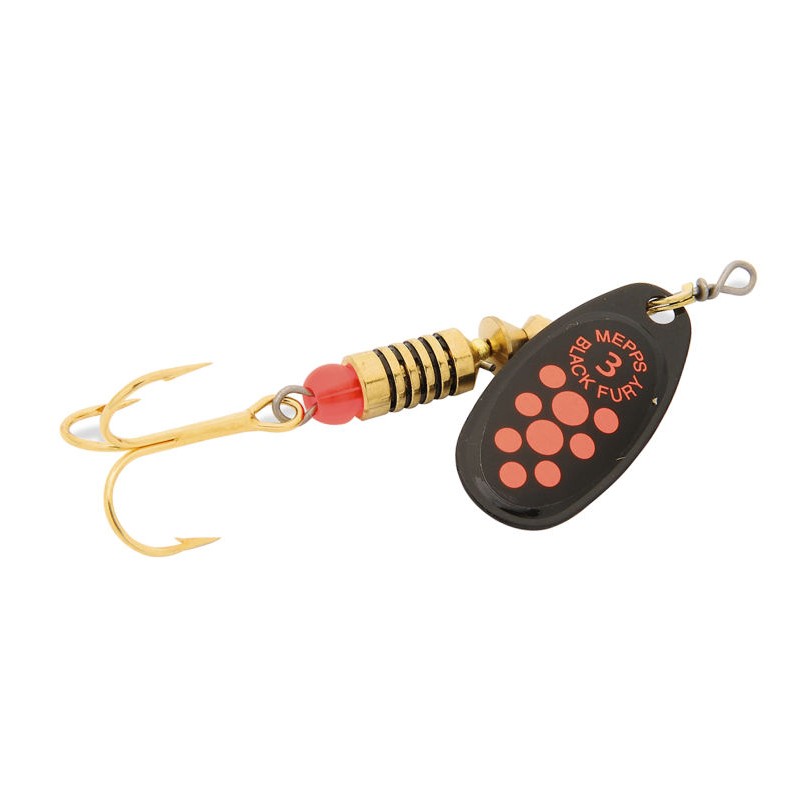 MEPPS BLACK FURY - TREBLE HOOK, PLAIN FLUORESCENT RED, 1/12OZ Item No. 008-249 MEDIUM RUNNER: The Black Fury was introduced in 1962 and became an overnight hit.To this day the only Mepps lure that is more popular is the original Aglia introduced in 1938. The Black Fury offers a medium depth running blade on a black muted background. For years there were two color choices,